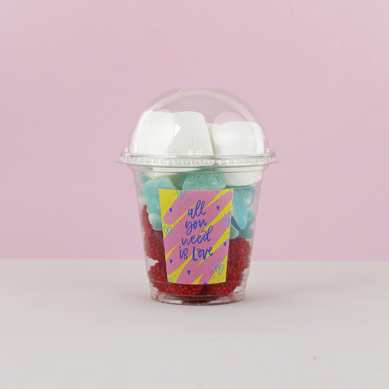 - Malteada: si a la persona que amas le gusta el dulce, pero no es muy amante del chocolate, esta opción es ideal. El regalo incluye un envase plástico con tapa domo de 300 ml, un sticker con mensaje personalizado y dulces surtidos como moritas, mini chips y masmelos.