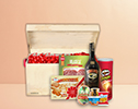 Caja en madera tipo baúl con agarres en cuero color corporativo y logo del cliente en tarjeta