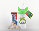 Botilito plástico. con orejas y pitillo, con ilustración de animal y tarjeta.