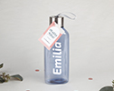 Botilito plástico con tapa metálica, nombre en vinilo adhesivo y tarjeta.