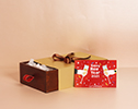 Caja pintada y agarre en cuero, con cubierta en cartulina y moño en cinta de tela color corporativo.