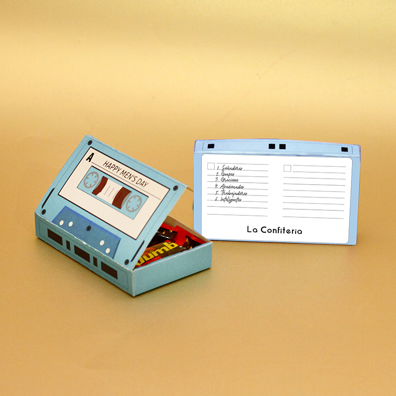 Caja tipo casete en cartulina fina con impreso y colores corporativos