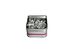 Caja metalica pequeña con mensaje en tapa y 26 unidades de chocolates Kisses