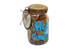 Frasco de Vidrio Mediano con Diseño y 16 Und de Chocolates Resses.
