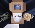 Caja en cartón micro corrugado, moño en cinta con diseño y tarjeta.