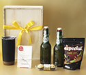 Un lindo detalle muy completo y funcional. Una hermosa caja de regalo en madera pino, en su interior dos cervezas y un hermoso termo que conserva la temperatura. Acompañados de mani y unos chocolates ferrero