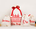 Empaque:• Saco de tela 50 x 35 cm y 3 sacos de tela 24 x 21 cm • Moño de tela y tarjeta con diseño