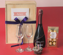 Vamos a celebrar el cumpleaños con un espumoso, una champagne, deliciosas sus burbujas. Un pequeño muffin, chocolates y copas de celebracion como se debe.