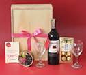 Un regalo hermoso, clasico, directo y especial. Una buena botella de vino tinto, dos copas, unos chocolates ferrero rocher, dulces y un empaque en madera pino